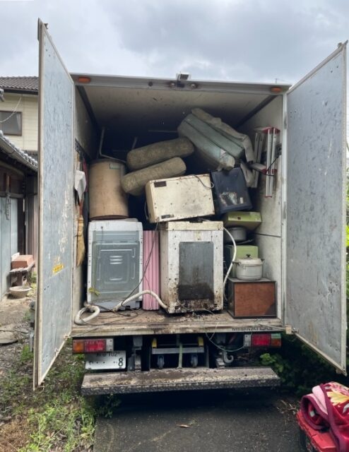2トントラックの載せ放題で、たくさん積み込みました。天気はずっと悪かったものの、作業中だけ幸いに雨は止んでました。部屋数の多い建物で、順番に処分しづらい物から運び出していきました。