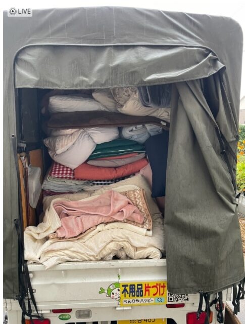主に寝具類をメインに、大量の整理となりました。使用していた物から、収納して しまっていた物まで、軽トラックで載せられるところまで、たくさん積み込みました。