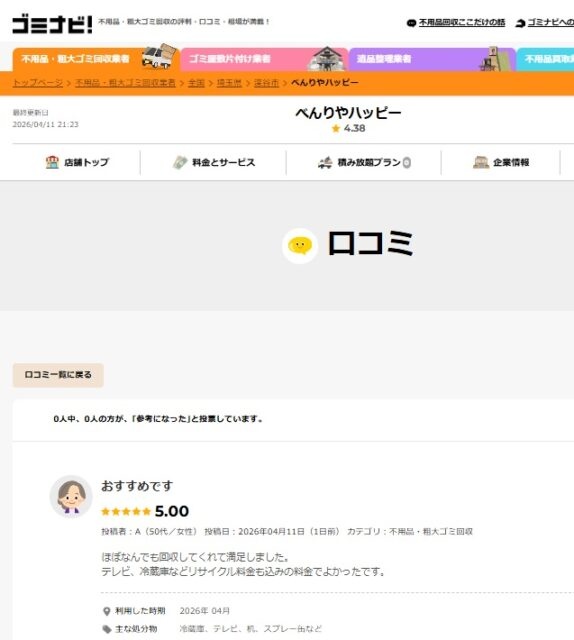 ゴミナビ! クチコミ おすすめです。投稿日: 2026年4月12日公開ほぼなんでも回収してくれて満足しました。 テレビ、冷蔵庫などリサイクル料金も込みの料金でよかったです。 https://gominavi.com/review_detail.php?c=1&shid=39826&rv=18他にこんな記事も読まれていますYouTube おきなわさんぽ 民泊「TOO」現在スケジュール大変 混み合っております。インターネット集客も大変な作業です。突然の雨、夕立ち、わからない天気です…。